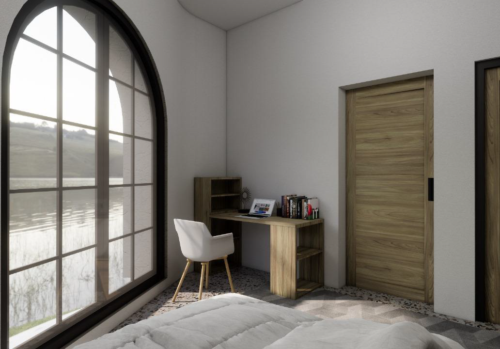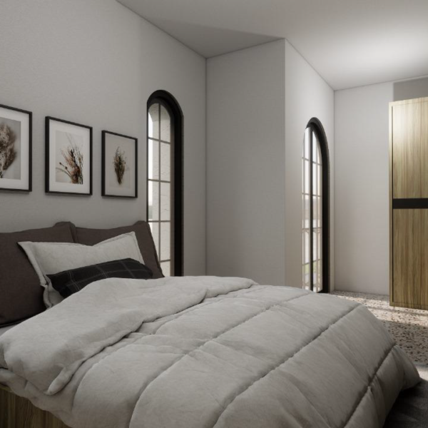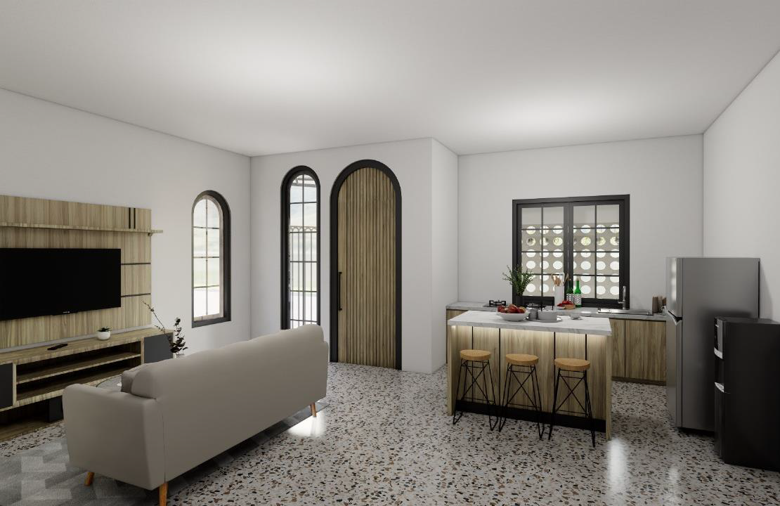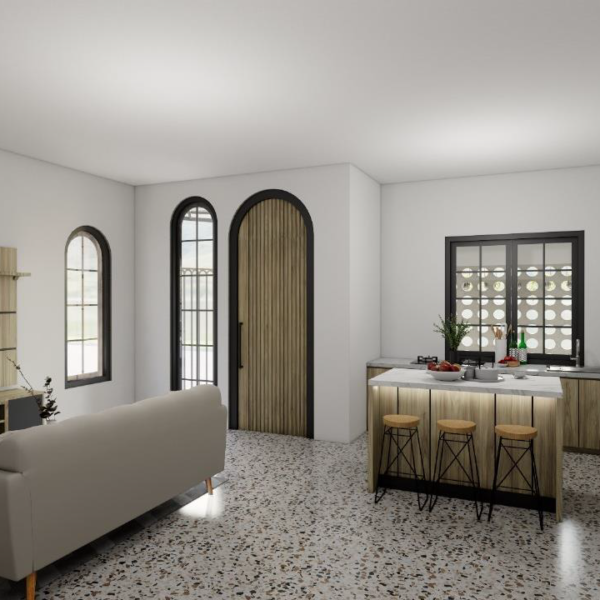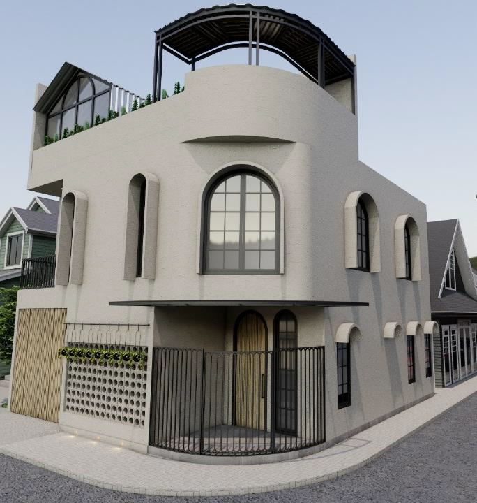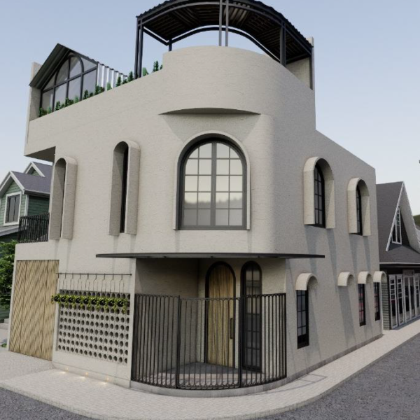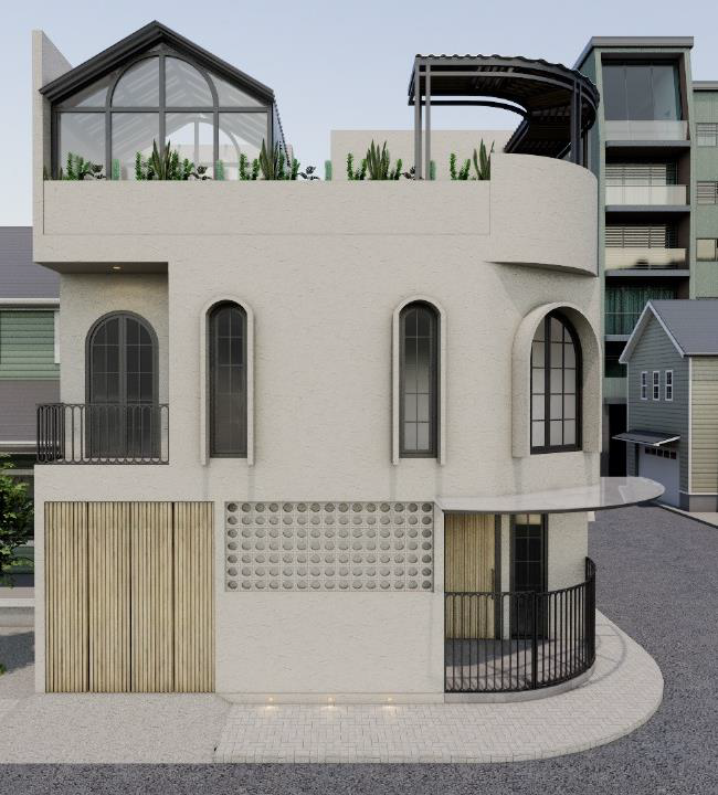 A modern and functional home featuring a unique curved facade and a rooftop terrace. The design incorporates large arched windows, natural materials, and a contemporary aesthetic, creating a striking and inviting exterior. It also feature an open-plan living area with a combined kitchen and dining space. The design incorporates natural light, neutral tones, and stylish accents, creating a comfortable and inviting atmosphere.